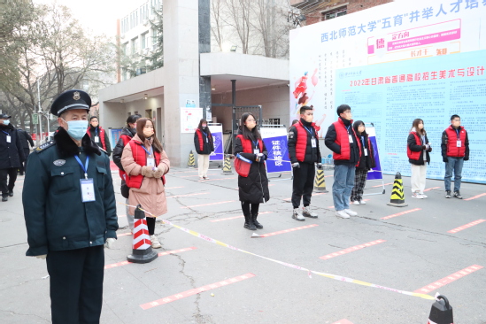 甘肃省普通高校招生美术与设计学类专业统一考试是普通高校招生考试的重要组成部分,也是新冠肺炎疫情防控常态化下我省2022年普通高校招生的第一考。为统筹做好疫情防控和考试组织工作,西北师大全面落实教育部有关艺术类考试会议精神,积极与省教育考试院沟通协商,全面启用甘肃教育考试易考通微信小程序,通过人脸识别、GPS定位、在线健康码获取等方式对考生进行健康打卡,加强考生精准分类管理;协调校内、外各单位,通过设立考生专用通道、场所定期消杀,安排专人实时医疗救护、发布考生指南等措施,全面加强疫情防控管理,做到不因疫情影响考试,不因考试引发疫情传播;启用考生身份核查新系统,在考试过程中采用人脸识别方式对考生、试卷、证件进行人机比对,确保人证、人卷相符,严防替考。