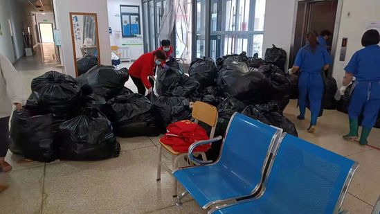楼管员毛凤秀自知行校区投入使用就一直做楼管工作,今年已是她工作的第10个年头了。5号楼封控期间,3名保洁人员和6名值班员负责西区和南区32层楼层卫生清洁、楼层消杀工作,同时负责整栋楼宇1800多名学生一日三餐分发,每天将近150袋生活垃圾需要处理。