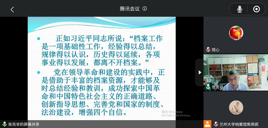 活动邀请兰州大学校史研究室主任张克非教授在线为甘肃省高校档案馆开展“用活档案资源”的档案专题讲座,学校档案馆人员及全省档案学会高校分会成员单位等200余人参加。张克非教授讲座深入浅出,从档案工作理论到实务,就如何提高档案策划能力,充分利用档案资源,创造档案文化精品,让档案“活起来”“亮起来”“火起来”,为大家作了精彩讲解。