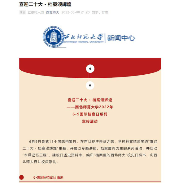 6月8日,学校官方微信公众号发布《喜迎二十大·档案颂辉煌》专题文章,瞬间点击量破千次。专题文章介绍了“6·9国际档案日”的由来、学校档案工作机构沿革、取得的重要荣誉等。