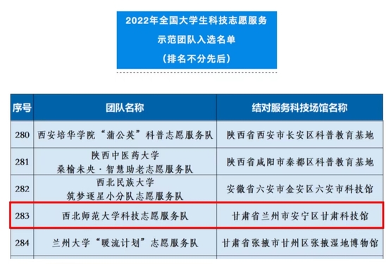 西北师大科技志愿服务队入选全国大学生科技志愿服务示范团队