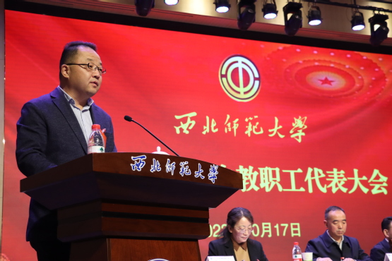 贾宁强调,面对新形势、新任务、新要求,我们依然存在许多短板和不足,改革发展任务十分艰巨。对此,我们要以时不我待的主人翁精神,以更加奋发有为、锐意进取的工作劲头,加快推进学校各项事业高质量发展。为此,我们必须提高政治站位,主动担当起办好中国特色社会主义大学的政治责任和历史使命,以党的二十大精神为指引,持续学习领会和贯彻落实习近平总书记关于教育的重要论述,继承和弘扬西北师大精神,更好地担当起培养德智体美劳全面发展的高素质人才的育人责任,更好地担负起建设教师教育特色鲜明的一流大学的光荣使命;必须聚焦一流大学建设目标,广泛汇聚发展共识,以更加严格的标准和规范的流程审视各项工作,让一流意识、一流目标、一流标准融入日常、贯穿始终,并把它转化为每个单位、每个部门、每一位师生员工的价值追求和自觉行动,汇聚起创建一流大学的广泛共识和强大合力;必须坚持问题导向,以自我革命的勇气破解制约学校发展瓶颈和难题,直面问题和不足,拿出自我革命的勇气,彻底解决思想观念、体制机制、谋划落实等方面存在的问题和短板,着力探索加快学校高质量转型发展的新思路新途径新举措,努力在一流学科和一流大学建设中取得显著进展;必须充分发挥广大教职员工主人翁精神,主动作为担当实干,把主要精力集中到干事创业上来,把主要功夫下到狠抓落实上来,以争先创优、不甘落后的劲头真抓实抓、苦干实干,形成人人想干事、人人能干事、人人干成事的浓郁氛围,在干事创业中创造辉煌业绩,实现人生价值;必须集思广益群策群力,重视发挥工会组织的桥梁纽带作用。各级党组织和领导干部要牢固树立全心全意依靠广大教职工办学治校,依靠教代会工会组织团结群众、落实工作的理念;各位代表要增强责任感、使命感,进一步增强履职的政治自觉、思想自觉、情感自觉和行动自觉,关心热爱学校事业,理解支持学校工作,严以律己,为人师表;工会组织要发挥好“职工之家”和“娘家人”的作用,紧密团结广大教职工,最大限度地为学校改革发展凝聚起强大合力。