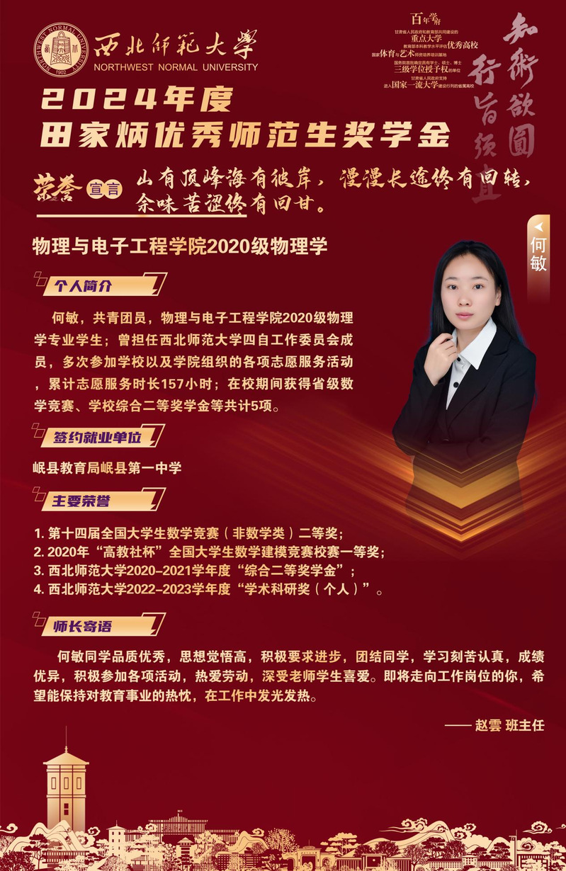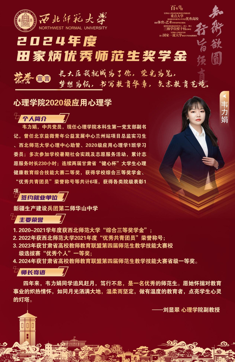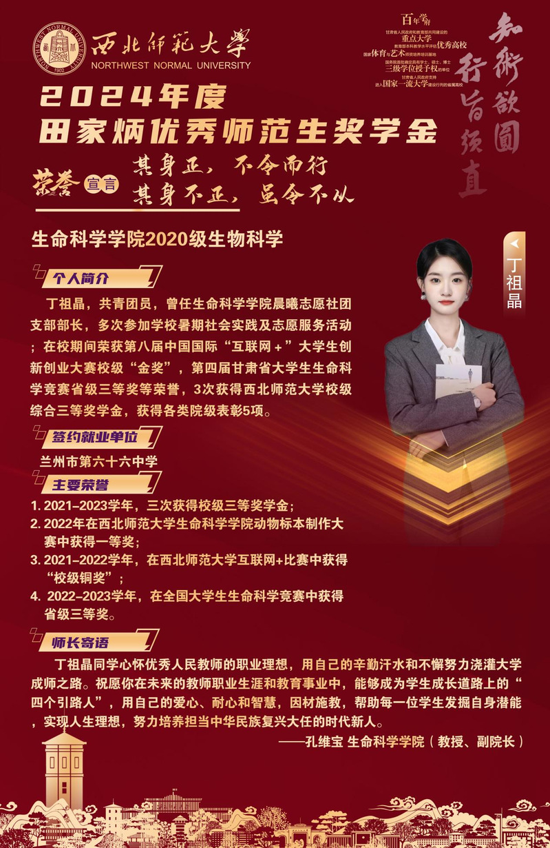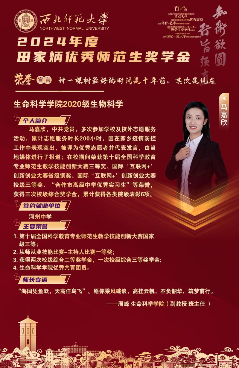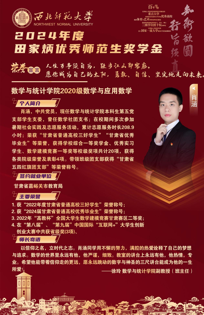 为树立“躬耕教坛 强国有我”的西北师大毕业生榜样,“田家炳优秀师范生奖学金”将荣誉赋予奔赴基层教育岗位的优秀毕业生,激励他们不断砥砺青春,续写华章。自本年度“田家炳优秀师范生奖学金”评选工作启动以来,经各学院推荐和资格审核,来自16个学院的48位优秀毕业生成为推荐候选人。其中参评一等奖、二等奖并进入最终答辩评审的22位优秀学子,他们敢于挑战,在科研领域勇攀高峰;他们无私奉献,用心用情服务师生;他们青春洋溢,在志愿活动中澎湃活力;他们脚踏实地,在扎根中国大地的教育使命中上下求索……