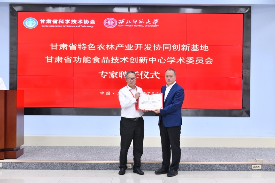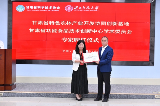 西北师大校长王占仁为院士、专家颁发了甘肃特色农林产业开发协同创新基地和甘肃省功能食品技术创新中心咨询专家委员会委员聘书。