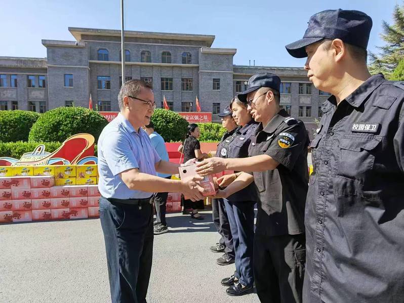 在党委保卫部门卫值班岗,王全进对暑期安全保障工作给予了充分肯定,无论在高温下的门卫值守,还是安全巡逻,大家都毫无怨言、坚守岗位。感谢同志们为师生提供的安全与稳定,叮嘱大家要注意做好消暑降温和自身健康防护,并代表学校送上防暑慰问品。