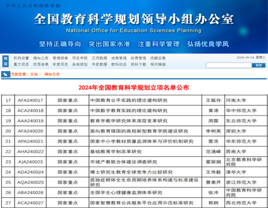 2024年7月31日,教育部社科司公示了2024年度教育部人文社会科学研究一般项目评审结果,我校教育学科获批8项,教育学科立项数居全国前列,创历史新高。