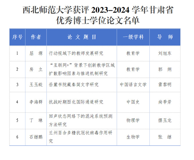 西北师大20篇论文获评2023—2024 学年甘肃省优秀博士硕士学位论文