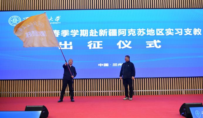 会上,张明军向带队教师代表卓杰授新疆阿克苏实习支教团团旗。他在讲话中指出,自2008年首开教育援疆先河以来,西北师大“支教专列”已连续17年开赴新疆,累计派出32批8299名学子扎根阿克苏地区,为当地教育发展注入了青春力量。他希望即将前往阿克苏支教的学生以教育家精神为引领,践行“四有”好老师标准,在祖国边疆书写师者的担当与情怀,早日成为一名合格的人民教师。